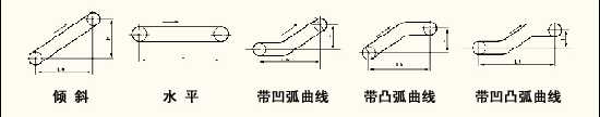 1.水平輸送。2.傾斜輸送機(jī)。3.帶凸弧曲形段輸送機(jī)。4.帶凹弧曲形段輸送機(jī)。5.帶凹弧及凸弧曲形段輸送機(jī)。