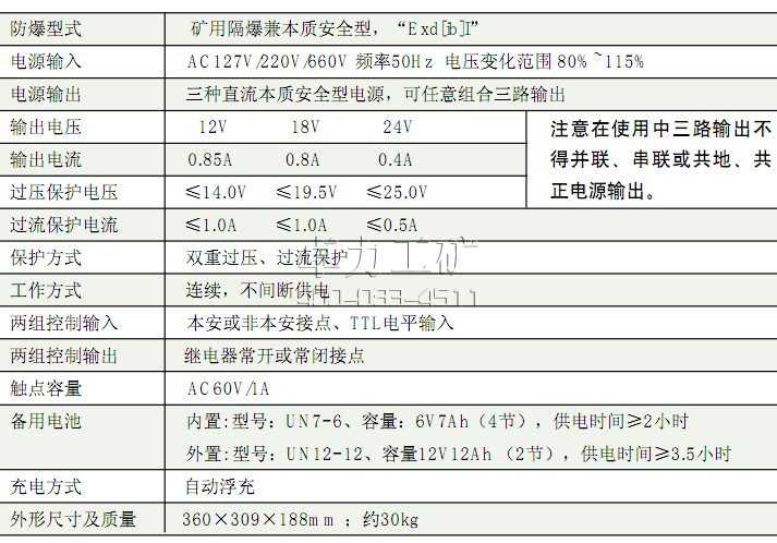 KDW17型電源是一種允許在外司煤塵爆炸危險環境中使用的通用型隔爆兼本質安全型不間斷電源,三路12V、18V、24V本安電源(可任意組合)輸出,并有兩組繼電器控制隔離輸出回路。用語向本質安全型設備提供本安直流電源,同時可用語斷電控制。