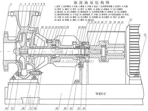 導熱油泵的支撐采用了雙端球軸承支撐的結構形式,前端采用潤滑油潤滑,后端采用潤滑脂潤滑,中間有一導油管,用以隨時觀察密封情況和回收導熱油。