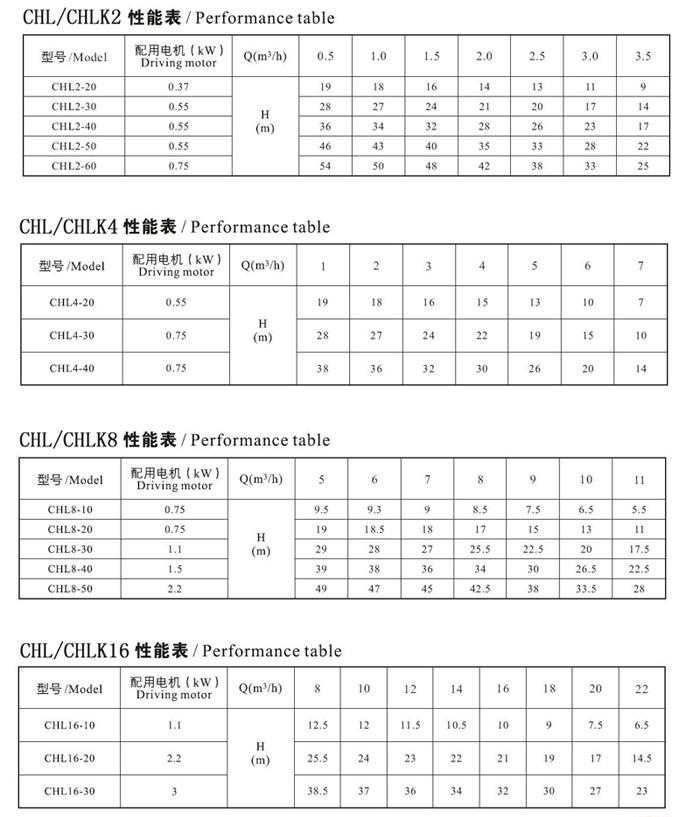 七、CHL,CHLK輕型不銹鋼多級離心泵(性能參數(shù)):