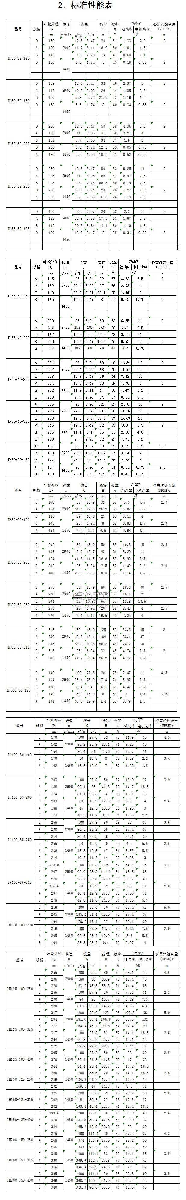 IH50-32-125、IH50-32-160、IH50-32-200、IH50-32-250、IH65-50-125、IH65-50-160、IH65-40-200、IH65-40-250、IH65-40-315、IH80-65-125、IH80-65-160、IH80-50-200、IH80-50-250、IH80-50-315、IH100-80-125、IH100-80-160、IH100-65-200、IH100-65-250、IH100-65-315、IH125-100-200、IH125-100-250、IH125-100-315、IH125-100-400、IH150-125-250、IH150-125-315、IH150-125-400、IH200-150-250、IH200-150-315、IH20-150-400