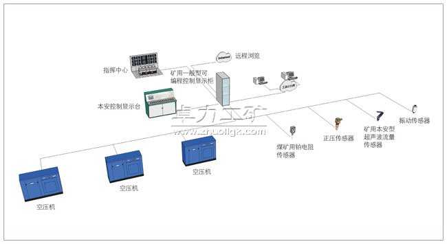 - 整個系統(tǒng)由礦用礦用一般型可編程控制顯示柜 (PLC)、液晶屏、各種保護傳感器和集控軟件部分組成。調(diào)度中心與控制站之間通過光纖總線方式連接組成控制網(wǎng)絡,壓風機分站之間即相對獨立,又互相聯(lián)接,組成一套靈活的系統(tǒng)。