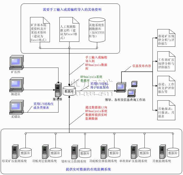 在山東科技大學礦壓理論研究基礎上,采用新的軟件設計理念、先進的軟件開發工具以及可視化技術、數據庫技術等研發了這套RPAnalysis系統。該系統按采場選用支護設備的不同分為單體、綜采、綜放三個部分,巷道則按照回采巷道、掘進巷道進行分類,分別使用于炮采和普采工作面、綜采工作面、綜放工作面、回采巷道、掘進巷道。利用礦壓理論、人工智能、模糊數學、有限元等進行推理出支柱支護密度及強度相關的支護數據,比經驗支護更科學,更合理。它不僅包容大量理論、實踐成果和專業知識,而且借助實時監測數據庫近乎無窮的知識記憶力和功能擴散力,發揮出以專家系統代替專家工作的特殊作用,是加強采場及巷道安全管理,防止頂板事故的有效手段,高度體現了礦壓觀測數據分析與評價的科學性,合理性。系統功能