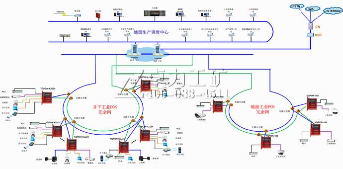 目工業(yè)PON環(huán)網(wǎng)系統(tǒng)為礦用環(huán)境直接提供以太網(wǎng)、POTS、CAN 、RS485和BNC等接口的子系統(tǒng)的信息接入,實現(xiàn)維護圖形化、遠程化、并且對全網(wǎng)重要設(shè)備實現(xiàn)備份,從而降低維護的難度提高了系統(tǒng)的安全性。該系使用硬件切換技術(shù),可保證冗余鏈路切換時間<2ms,系統(tǒng)快速自愈,不會丟失系統(tǒng)數(shù)據(jù)。該系統(tǒng)代表了礦用信息通信領(lǐng)域最線前沿的技術(shù)方向。同事該系統(tǒng)在同一傳輸網(wǎng)絡(luò)平臺和軟件平臺的基礎(chǔ)上,將最新傳輸技術(shù)應(yīng)用在生產(chǎn)、管理調(diào)度、監(jiān)控檢測等各個環(huán)節(jié),進而完善、改進和整合現(xiàn)有井下各個系統(tǒng)的同時,實現(xiàn)了煤礦的安全、生產(chǎn)、經(jīng)營和管理等信息集成。拓撲圖