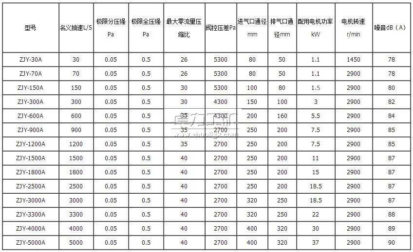 三、ZJY系列帶溢流閥羅茨真空泵主要技術(shù)性能指標(見下表)